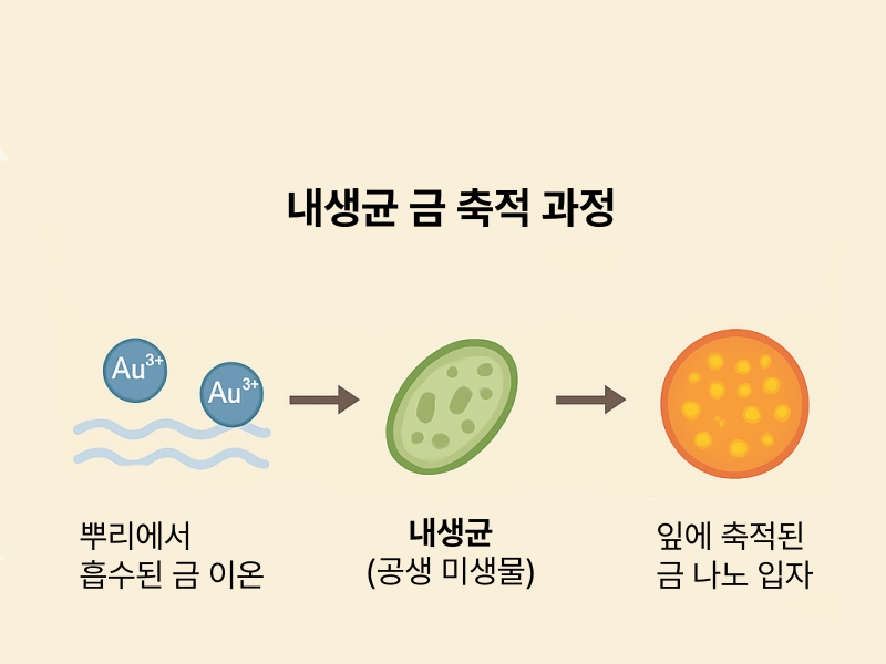가문비나무의 뿌리와 잎 속에는 내생균(endophyte)이라는 공생 미생물이 존재합니다. 이 미생물들은 식물 내부에서 호르몬 생성, 영양분 흡수, 금속 이온 흡착 등을 돕는 역할을 하는데, 이 내생균이 금을 잎에 있게한 주인공입니다. 내생균이 토양 속 용해된 금 이온(Au³⁺)을 뿌리를 통해 흡수한 뒤, 독성을 줄이기 위해 나노입자 형태로 바꾸어 잎에 축적시킨 것으로 분석됐습니다.