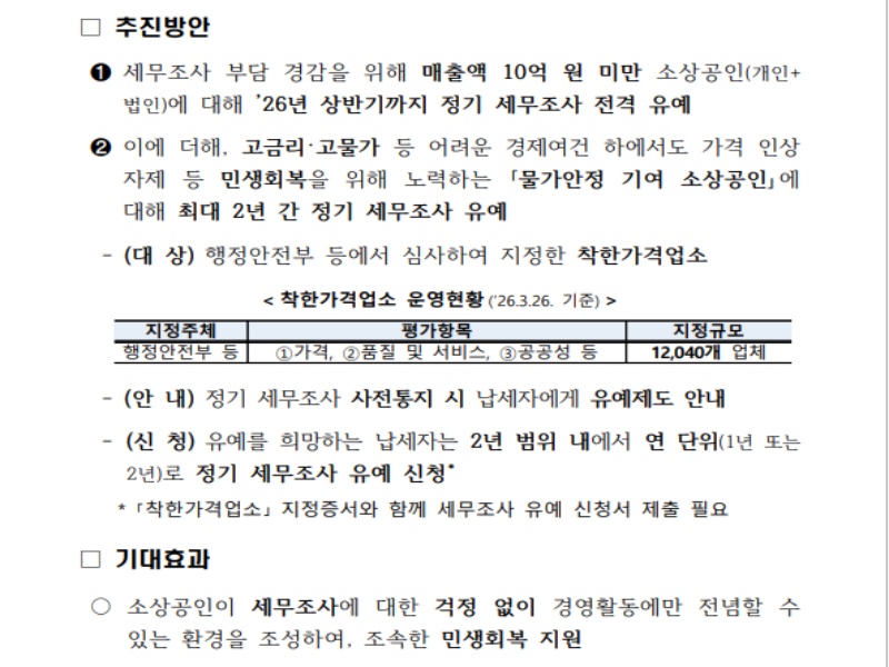 - 세정 지원 혜택: 이번 개편과 함께 물가 안정 소상공인은 최대 2년간 세무조사 유예 혜택도 받을 수 있으니 함께 챙기시기 바랍니다.