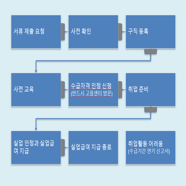 서류 제출 요청 → 사전 확인 → 구직 등록 → 사전 교육 → 수급자격 인정 신청(반드시 고용센터 방문) → 취업 준비 → 실업 인정과 실업급여 지급 → 실업급여 지급 종료