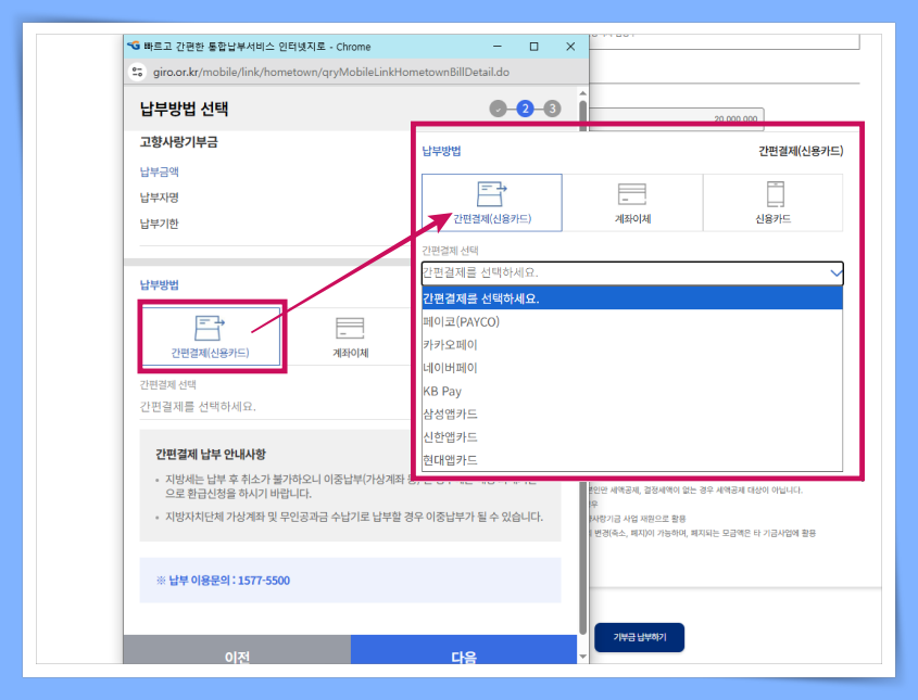 드디어 납부창이 떴네요. 결제는 대부분 카드와, 계좌이체가 가능해요. 여기에 요즘 많이 사용하시는 카카오페이, 네이버페이, KB페이 등으로도 결제가 가능하답니다.