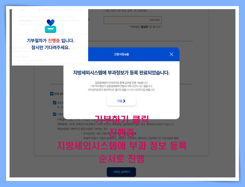 납부하기를 클릭하면 "기부절차가 진행중입니다" → "지방세외시스템에 부과정보가 등록 완료되었습니다"라는 창이떠요. 이후 "다음"을 클릭하면 납부창이 뜬답니다.