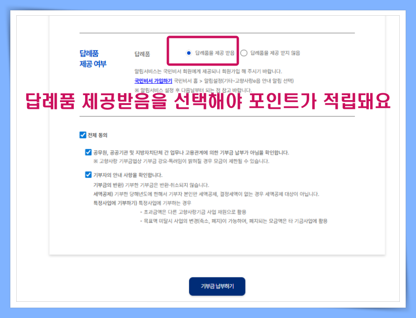 디폴트가 "답례품을 제공 받음"으로 되어있기 때문에 답례품을 받고 싶지 않을때는 받지 않음을 선택하시면 됩니다. 답례품은 포인트로 적립된후 해당 지자체에서 제공하는 물품을 본인이 선택할수 있기 때문에 제공받는걸 권해요.