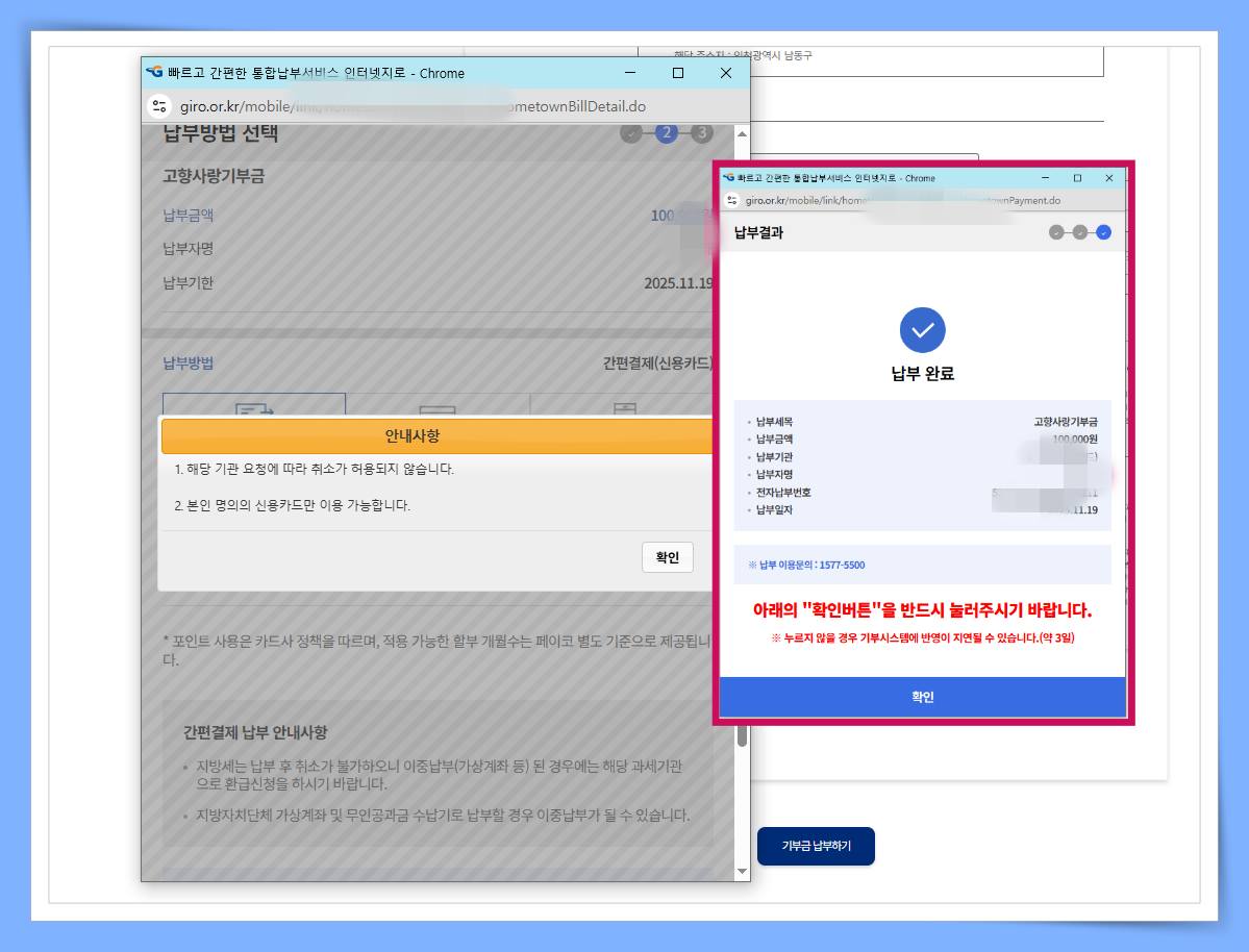 평소 기부는 하고 싶지만 방법을 몰라서, 고향사랑하는 마음은 있지만 어떻게 마음을 전하는지 몰라서 망설였다면, 제가 알려드린 방법으로 오늘 고향사랑기부금 납부해보시는건 어떨까요?