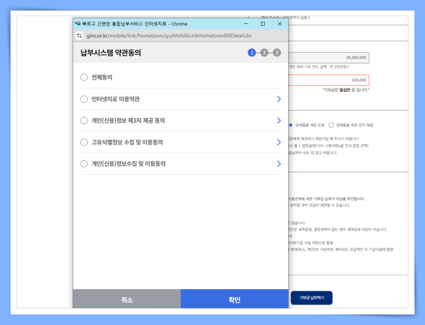 인터넷지로로 바로 연결되어 납부시스템 약관 동의 절차 창이떠요. "전체동의" 확인