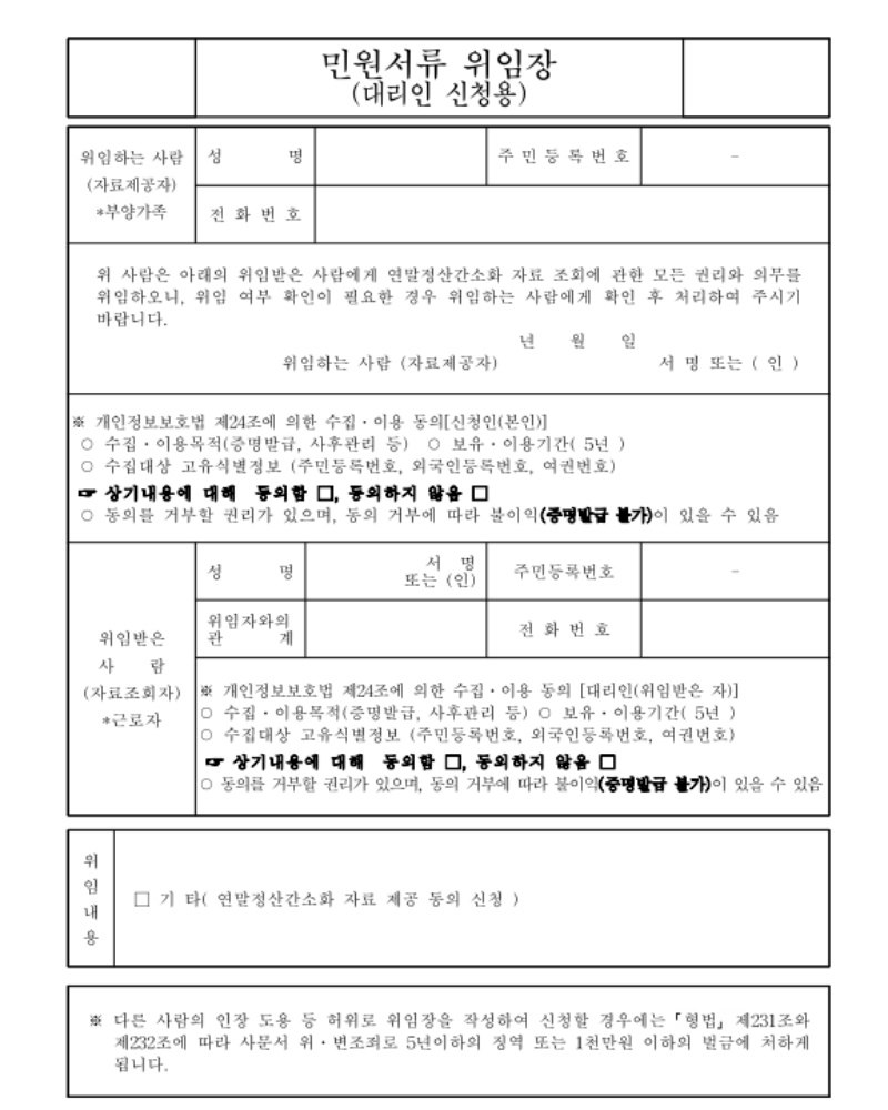 대리신청시는 제공동의 신청서와 민원서류 위임장 및 대리인의 신분증 사본과 가족관계 확인서류가 필요합니다.