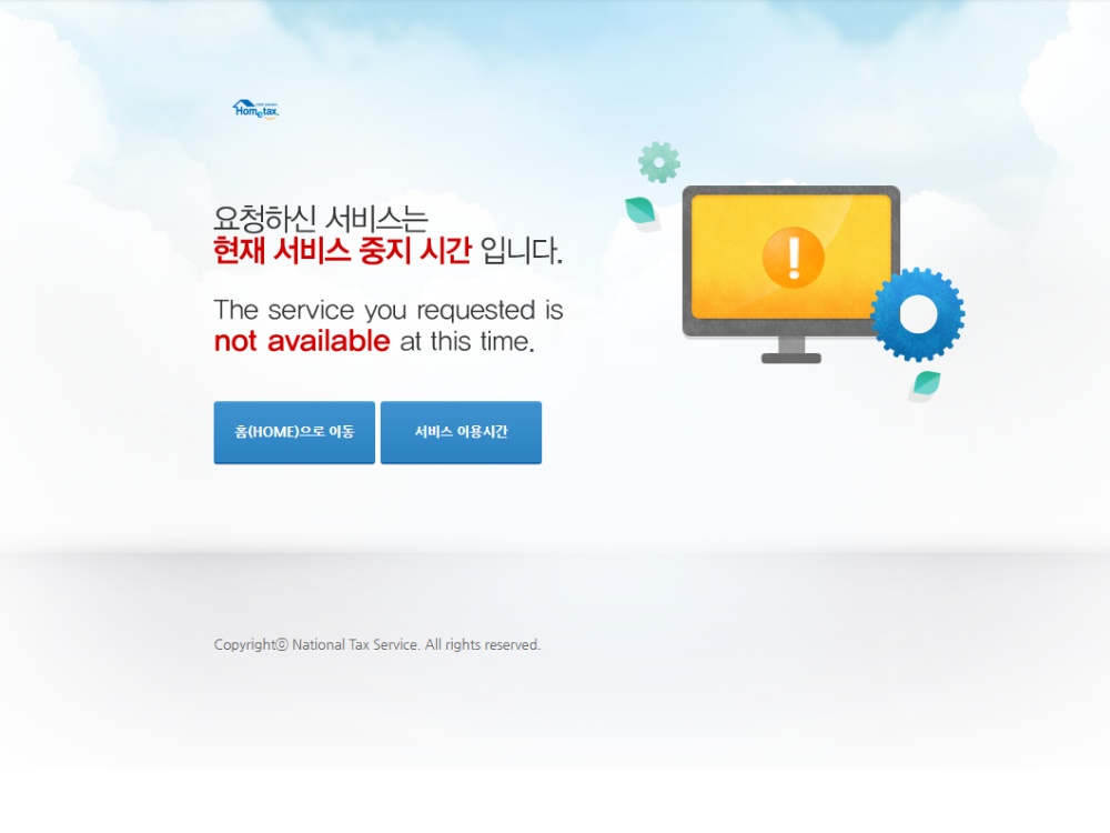 따라서, 국세청은 서버 부하가 커지는 시간대와 들어온 자료에 문제가 없는지 시스템에는 이상이 없는지 등의 파악과 정비를 위해 서비스를 일시적으로 제한하는 시간대가 있습니다. 이때 화면에 뜨는 문구가 바로 "현재 서비스 중지 시간”입니다.