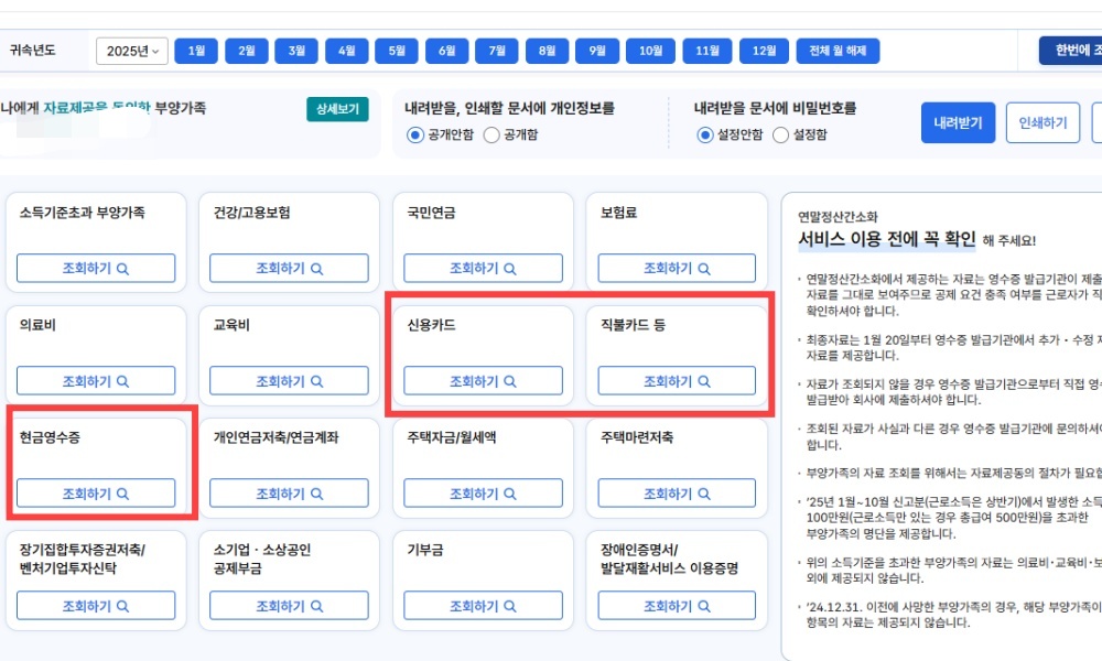 매년 1월 중순부터 조회가 가능하지만 최종자료가 반영된것은 아닙니다. 의료비, 보험료, 교육비 등 대부분이 누락되어 있을 가능성이 크고, 해외사용카드 실적은 정산주기와 시스템 점검의 문제로 1월말이 되어서야 확인가능합니다.