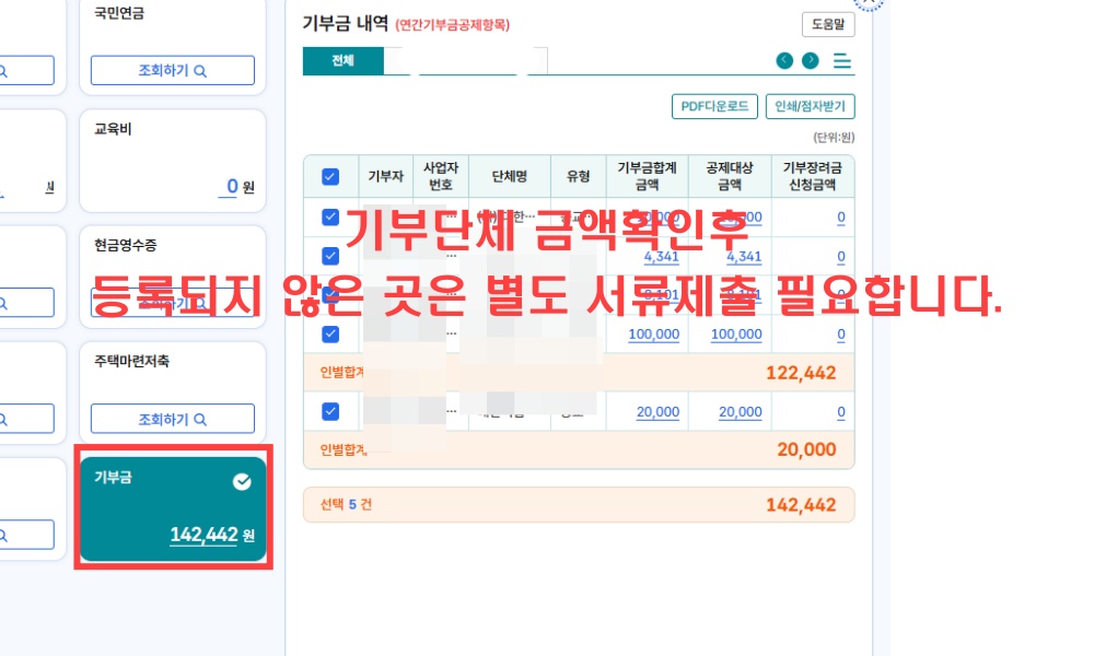 기부금은 지로로 발송되어 납입한 경우(적십자회비 등)는 간소화에 올라오나 개인적으로 납입한 여러항목이 누락되는 경우가 많으니 꼭 꼼꼼하게 챙겨야하는 부분입니다.