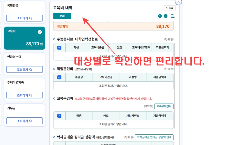 다만, 어떤 곳에서 교육을 받았냐에 따라 비공제 대상이 될수 있습니다. 주로 아아들이 다니는 사설학원은 비공제대상으로 많이 높치는 부분입니다. 꼭 현금 및 카드로 사용내역을 조회해 혜택을 받으셔야합니다.