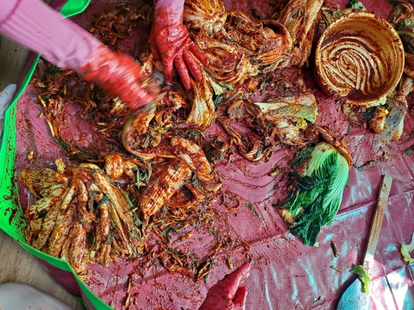 이제 잘 버물리시면 되는데, 김장배추는 포기가 유지되게 한장한장 배추잎을 들고 양념이 잘 묻도록 해주셔야 맛있는 김치가 된답니다. 맨손으로 하면 나중에 손이 화끈거리고 붉은 물이 들수 있으니 꼭 고무장갑 착용하시고 양념속 잘 넣어주세요. 빠지면 맛없어요.