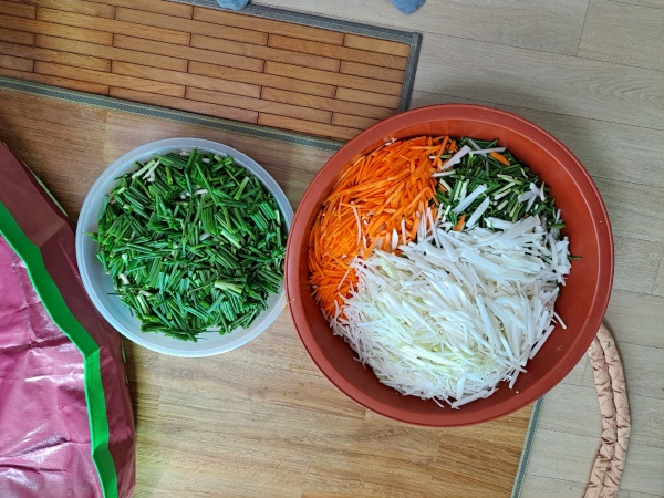 아침일찍 고추가루는 쌀풀에 풀어서 불리고 골고루 자주 저어줘야 뭉치지 않아요. 준비한 무우와 당근, 갓, 대파, 쪽파 등은 채썰기를 썰어야해요. 무, 당근은 채칼로, 쪽파, 갓 등은 3~5cm정도로 썰어주면 되고, 대파는 어슷썰기로 준배해요.
