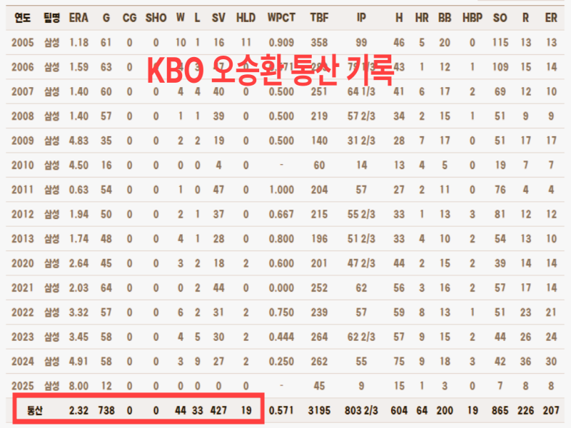 - KBO 리그: 738경기, 44승 33패, 427세이브, 평균자책 2.32