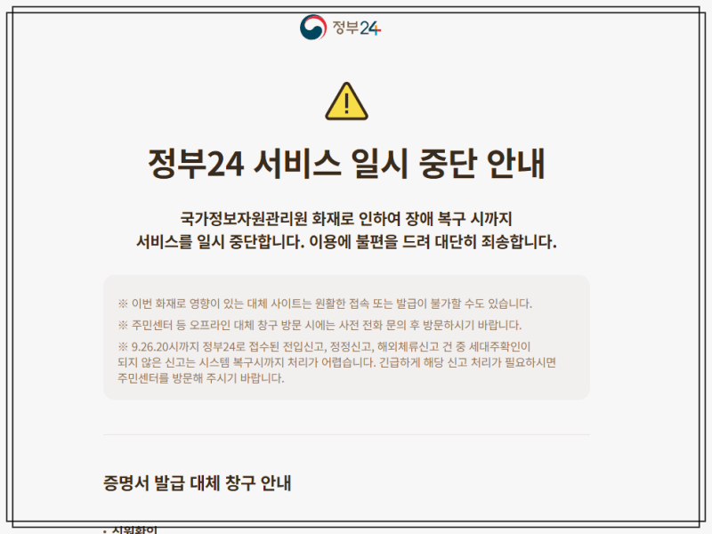 - 정부는 복구 전까지 신분증 사본(사진·팩스), 정부 대체 누리집, 민간 앱도 한시적으로 인정한다고 발표