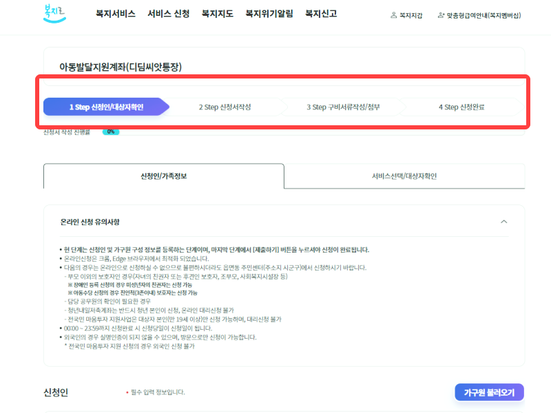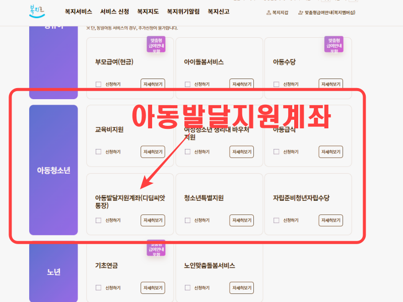 경로: 로그인 → 서비스 신청 → 복지급여 → 아동청소년 → 아동발달지원계좌