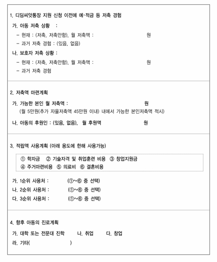 이후 서류첨부단계에서 해당 서류를 첨부하면 되는데 디딤씨앗통장 계획서는 위와같이 되어있으니 본인 상황에 맞게 금액을 적고, 적립 사용계획까지 용도에 맞게 작성 첨부하시면 됩니다.