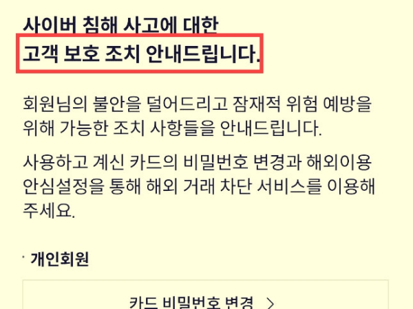 📌일단 피해가 발생되면 금융적 피해를 되돌리기 어려워요. 최소한 유출 가능성이 제기 되었을때 부터 카드비밀번호는 꼭 변경하세요. 또한, 유추하기 쉬운 생일, 전화번호, 차넘버 등 유추 가능한 번호로 재설정하면 안돼요.