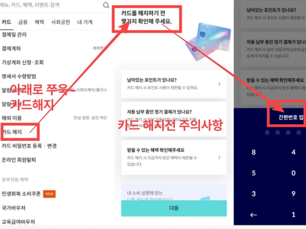 카드해지를 찾으셨다면 절반의 성공이예요. 카드해지를 터치하면 카드를 해지하기전 주의 사항이 나와요. 카드 해지전 남아있는 포인트, 자동 납부중인 거래 옮기기 등의 안내사항이 나와요. 잘 읽어보시고 하단의 "다음" 버튼을 클릭하면 간편비밀번호 및 개인인증을 하게 돼요.