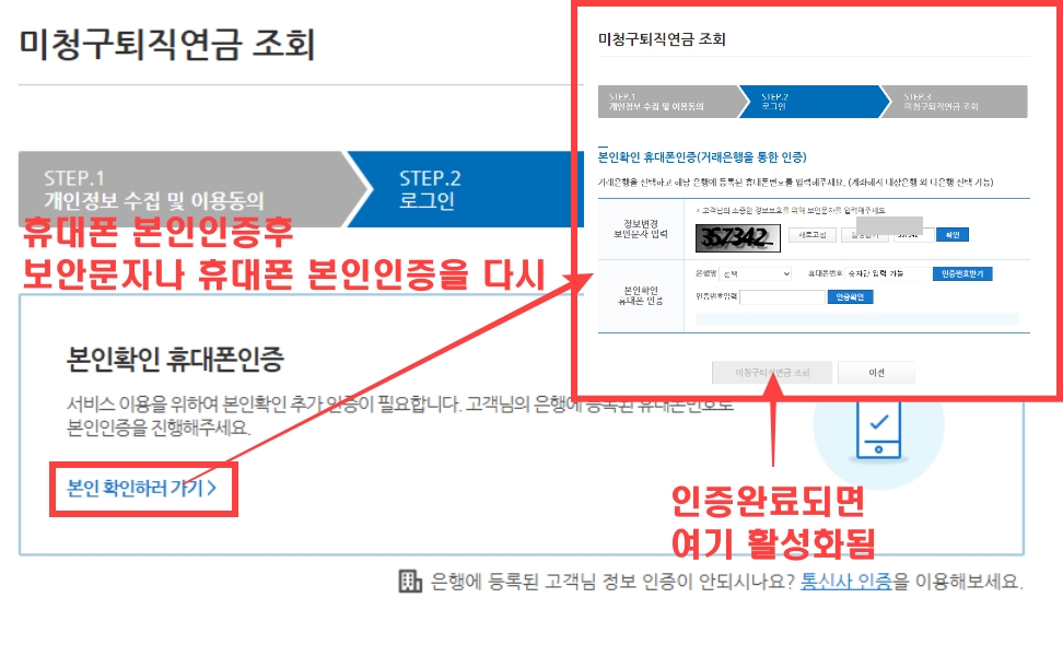 다시한번 휴대폰 본인인증을 하하고 보안문자 입력이나, 휴대폰 인증을 하면 비청구퇴직연금 조회 버튼이 활성화되고 클릭하면 됩니다.