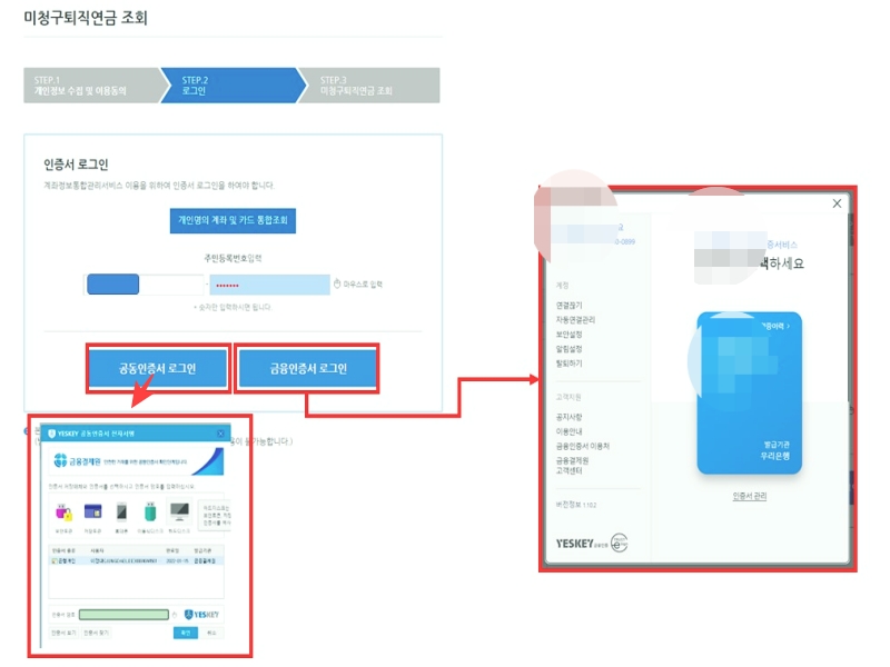 일단 공동인증서는 평소하시던데로 하시면 되고, 만일 없으신분들은 금융인증서로그인이 가능해요. 다만 인증을 받아야하는데, 개인정보를 넣으시고 ARS나 문자인증을 택해 화면에 보이는 숫자 입력방식으로 진행됩니다. 이렇게 인증을 하면 화면에 보이는것처럼 금융인증서가 뜹니다.