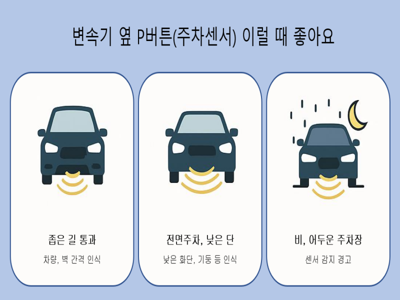 변속기 옆 P버튼은 주차센서의 수동 스위치입니다. 저속·시야 제한 환경에서 켜두면 접촉사고 가능성을 낮출 수 있어요. 다만 보조 장치이므로 카메라·미러·육안 확인을 반드시 병행하세요. 후진할 때 '삐빠~' 울리는 소리가 당연히 울리는것이 아닌 주차할때 당신이 보지 못하는 사각지역을 감지하고 알리는 소리임을 인지하시고 주의해서 주차하시기 바랍니다. 감사합니다.