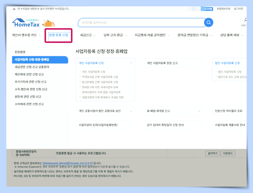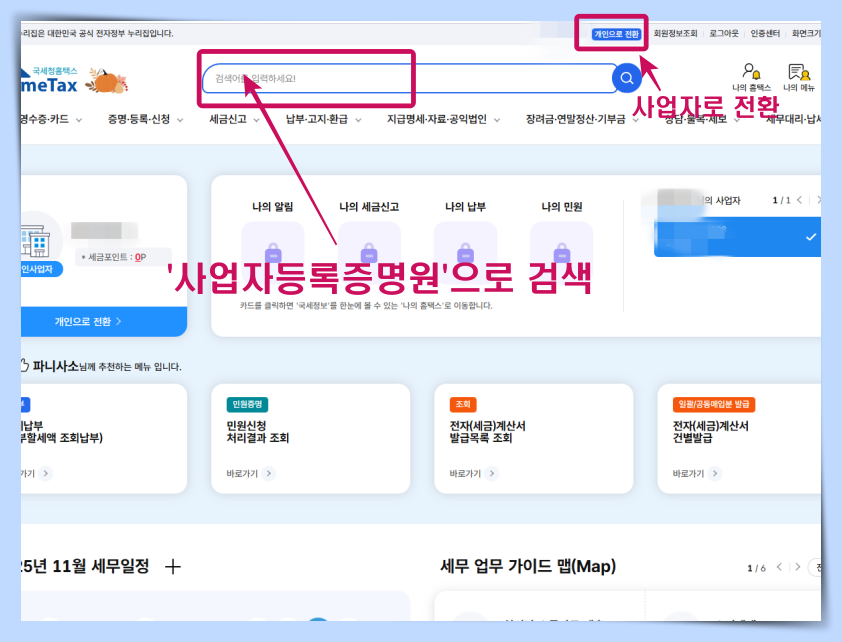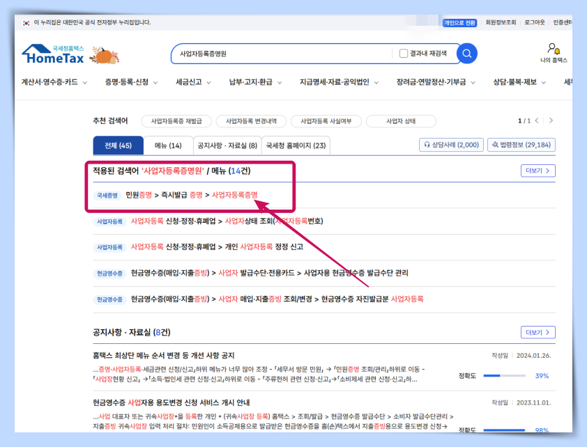 검색란에 '사업자등록증명원'으로 검색하면 편하게 원하는 정보로 가실수 있습니다.