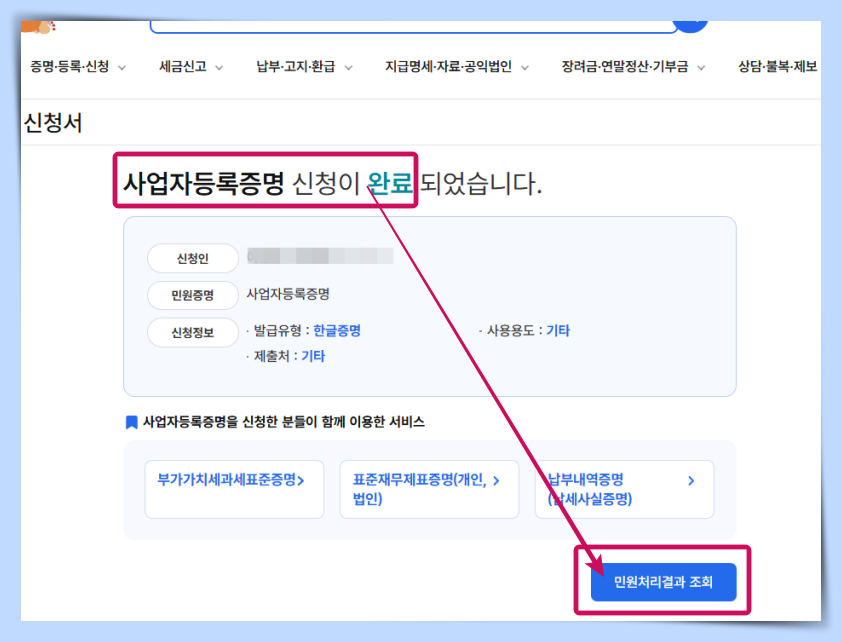 이제 완료 되었습니다. 사업자등록증명 신청이 완료되었습니다. 창이 뜨면 바로 우측하단의 '민원처리결과 조회'를 클릭하시면 바로 출력할수 있어요.