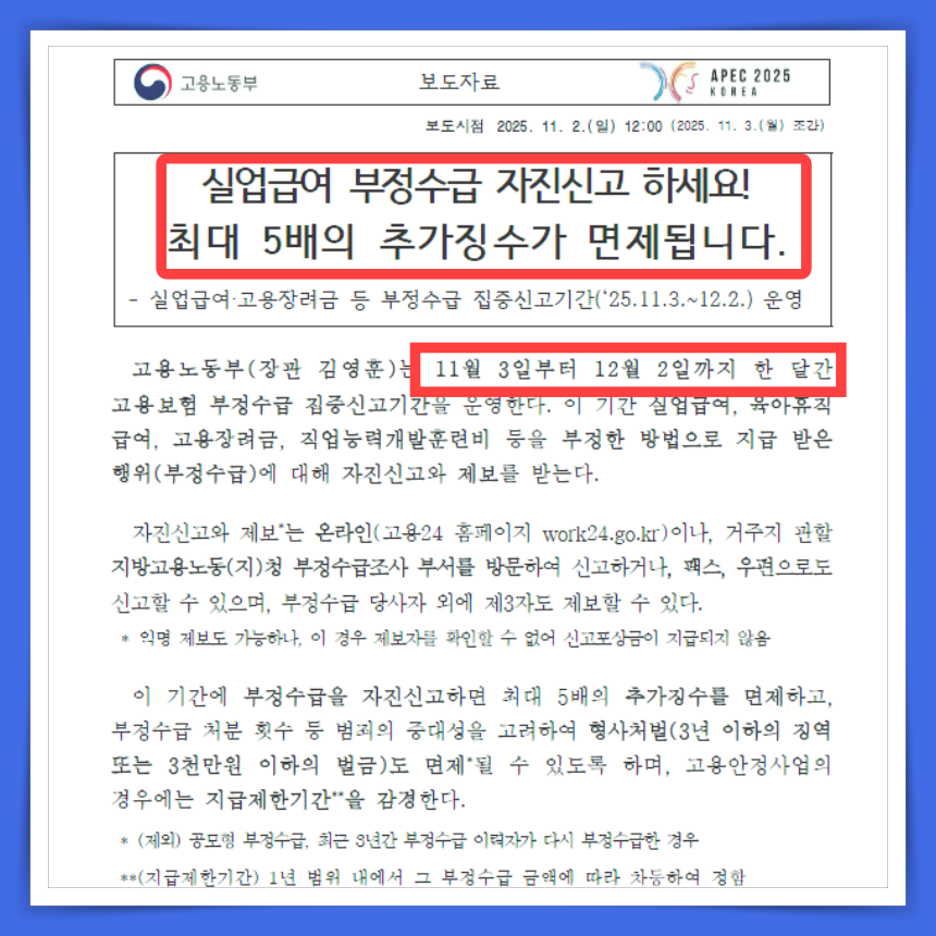 실업급여 부정수급 자진신고하면 5배 추징 면제! 지금이 기회