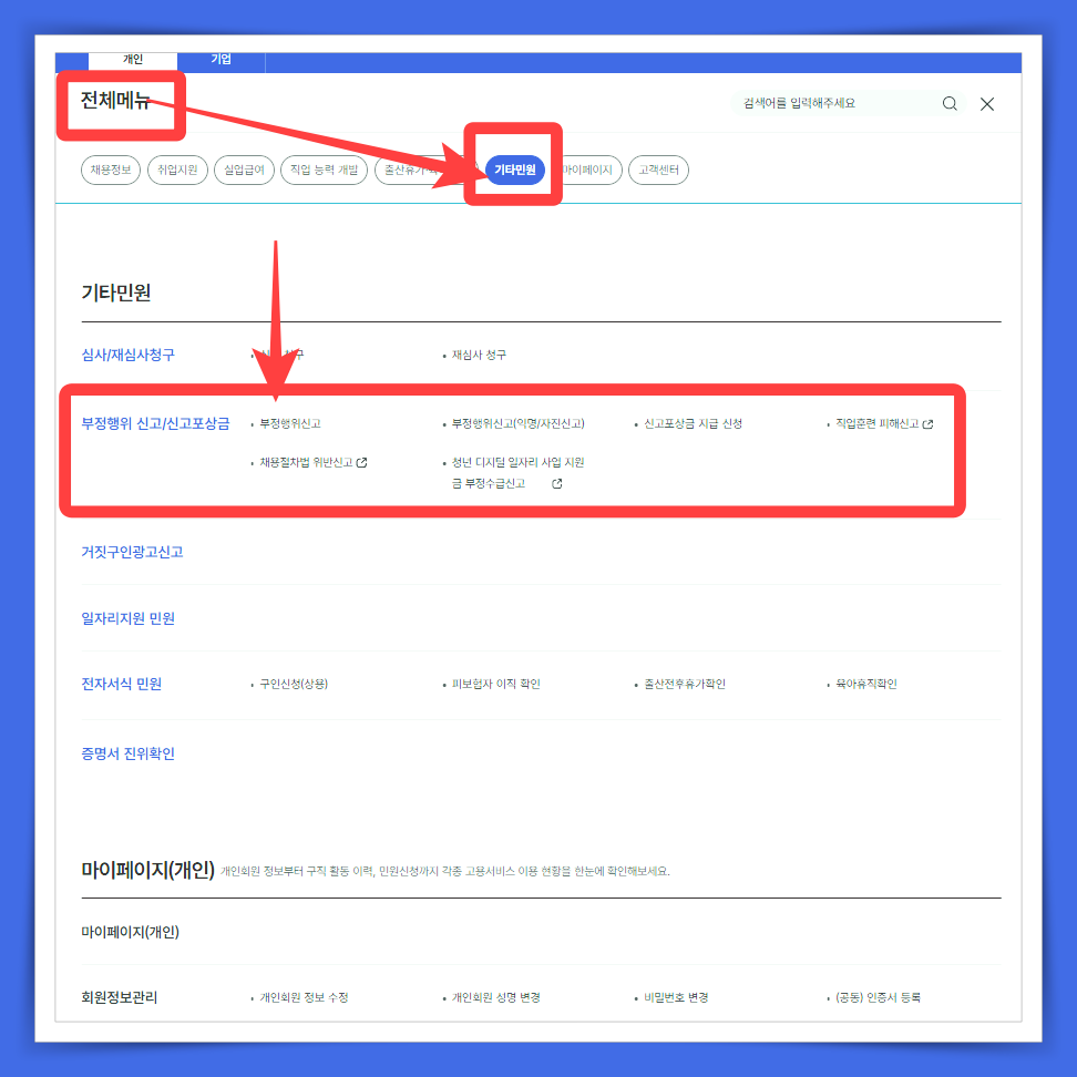 고용보험 홈페이지의 경우, 메인화면에서 우측 상단 전체메뉴 → 기타민원 → 부정행위신고(타인), 부정행위신고(익명/자진신고)에서 하시면 돼요.