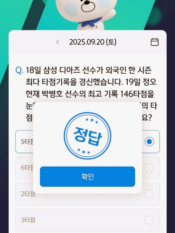 쏠야구 9월 20일 문제 : 18일 삼성 라이온즈 디아즈 선수가 외국인 한 시즌 최다 타점 기록을 경신했습니다. 19일 정오 현재, 박병호 선수의 단일 시즌 최다 타점 기록인 146타점을 눈앞에 두고 있는 디아즈 선수가 몇 개의 타점을 더하면 이 기록을 넘어설까요?