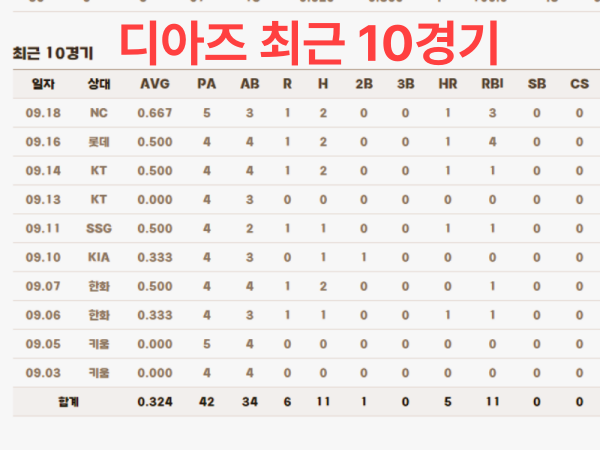 최근 9월 들어 타격 컨디션이 절정에 달해 경기당 타점 생산력이 높은 디아즈 선수는 확실히 상승세를 탄 모습이예요. 따라서 남은 경기수를 고려하면 충분히 박병호의 기록을 넘어설 가능성이 크다고 봐요.