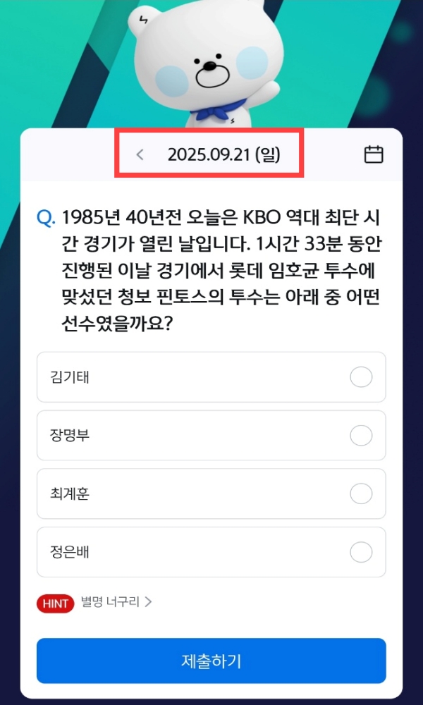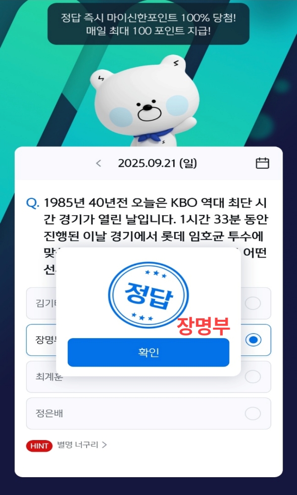 쏠야구 9월 21일 문제 정답 : KBO 최단 시간 경기 별명 너구리
