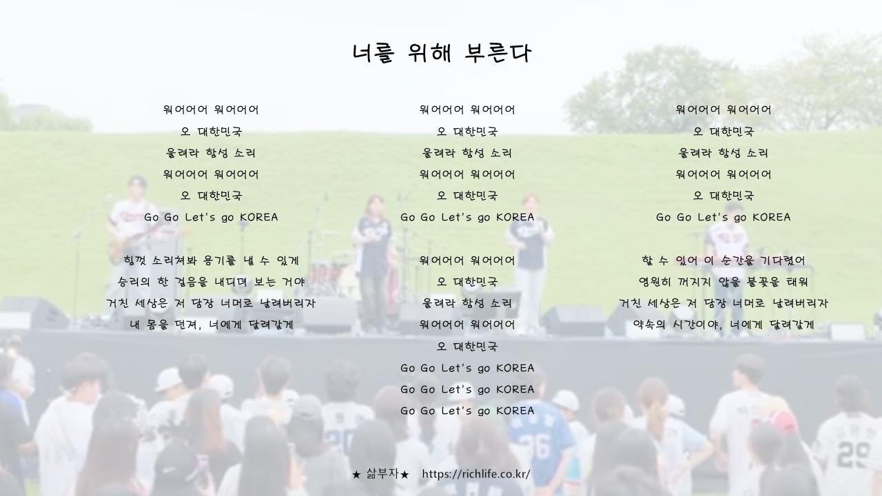 이 노래가 울려 퍼질 때마다 선수들은 다시 용기를 얻고, 팬들은 더 큰 자부심을 느낍니다. 결국 이 응원가는 대한민국 야구가 가진 정체성과 열정을 가장 잘 표현하는 상징이라고 할 수 있습니다. 앞으로 국제 무대에서 ‘너를 위해 부른다’ 노래가 울려 퍼질 때, 그것은 단순한 응원이 아니라 대한민국이라는 이름을 전 세계에 알리는 목소리가 될 것입니다.