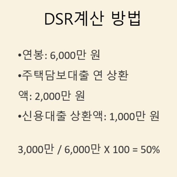 DSR(%) = (연간 모든 대출 원리금 상환액 ÷ 연소득) × 100