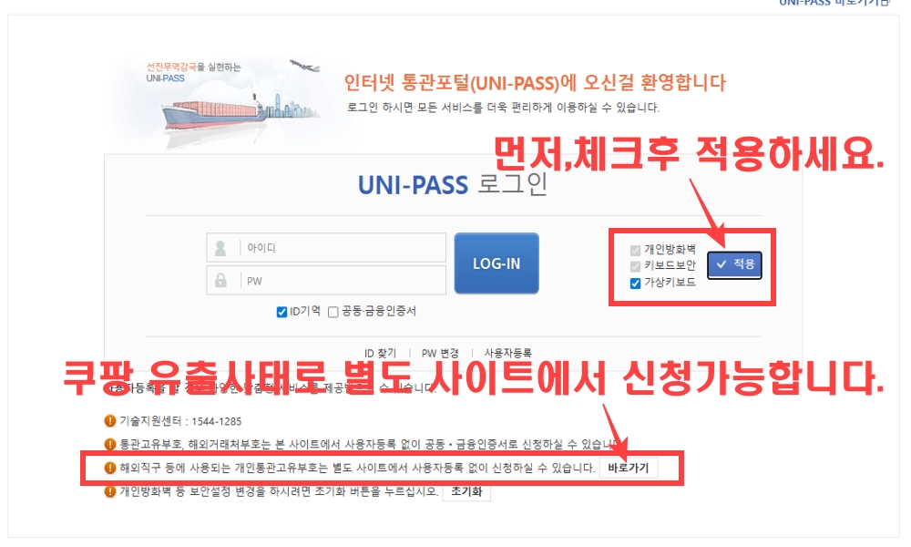 얼마전 개인정보 이슈때문에 서버가 나갔었는데, 이제 개인통관고유부호는 별도 사이트에서 신청을 받습니다. 사진처럼 해당부분 바로가기를 클릭하세요.