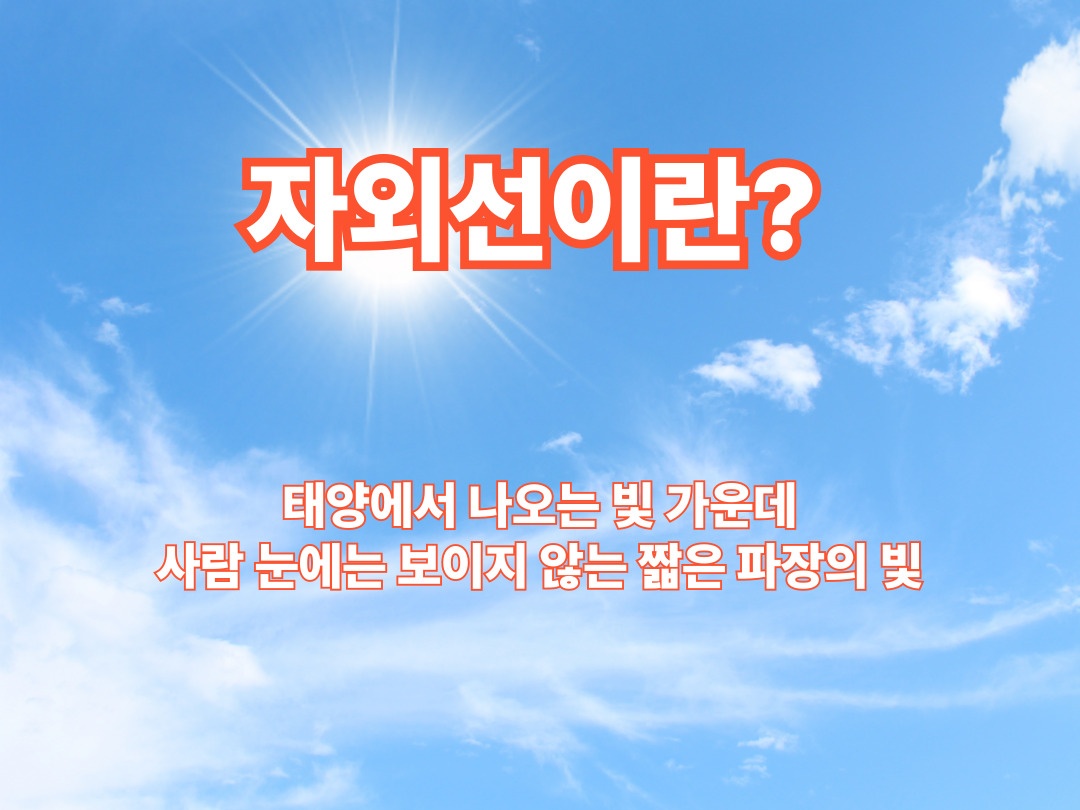 자외선은 태양에서 나오는 빛 가운데 사람 눈에는 보이지 않는 짧은 파장의 빛입니다. 영어로는 UV, 즉 Ultraviolet라고 부릅니다. 우리가 눈으로 보는 빛보다 파장이 짧고 에너지가 더 강해서, 피부와 눈에 영향을 주며 과도하게 노출되면 피부 노화와 일광화상, 피부암 위험을 높일 수 있습니다.
