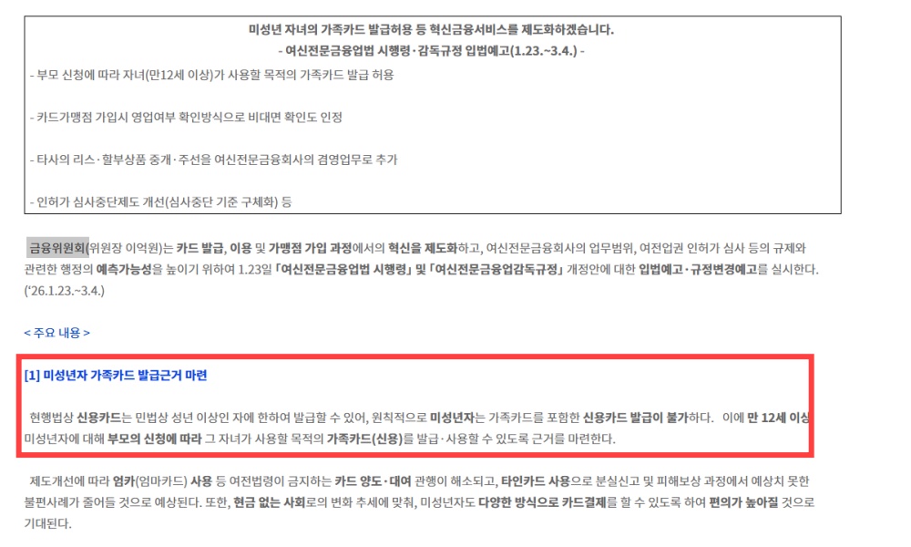 금융위원회가 여신전문금융업법 시행령과 감독규정 개정안을 입법하면서, 만 12세 이상 미성년자에 대해 부모 신청 시 자녀 사용 목적의 가족 신용카드를 발급할 수 있도록 근거를 마련했습니다.