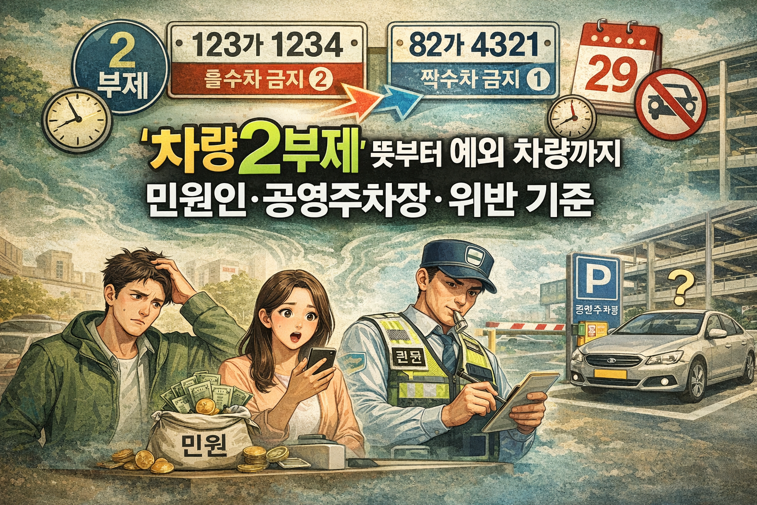 오늘은 차량2부제 뜻부터 예외 차량, 민원인 차량 적용 여부, 공영주차장 이용 기준, 위반 시 불이익까지 한 번에 쉽게 정리해보겠습니다. 복잡한 정책 설명보다, 실제로 내 차가 오늘 가능한지 바로 판단할 수 있도록 풀어드릴게요.