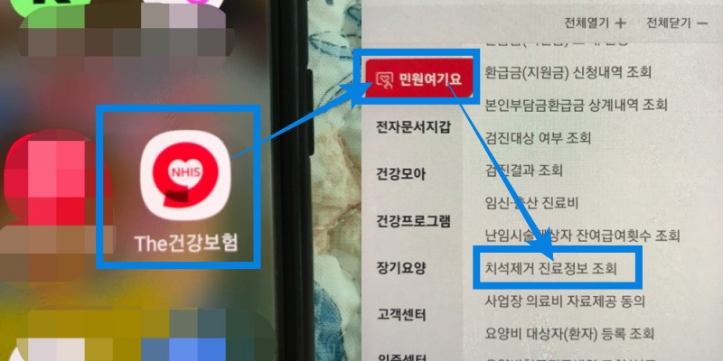 휴대폰에서 'The 건강보험'을 설치하고, 로그인후 민원여기요 탭에서 아래로 쭈욱 스크롤하면 '치석제거 진료정보 조회'에서 하시면 됩니다.