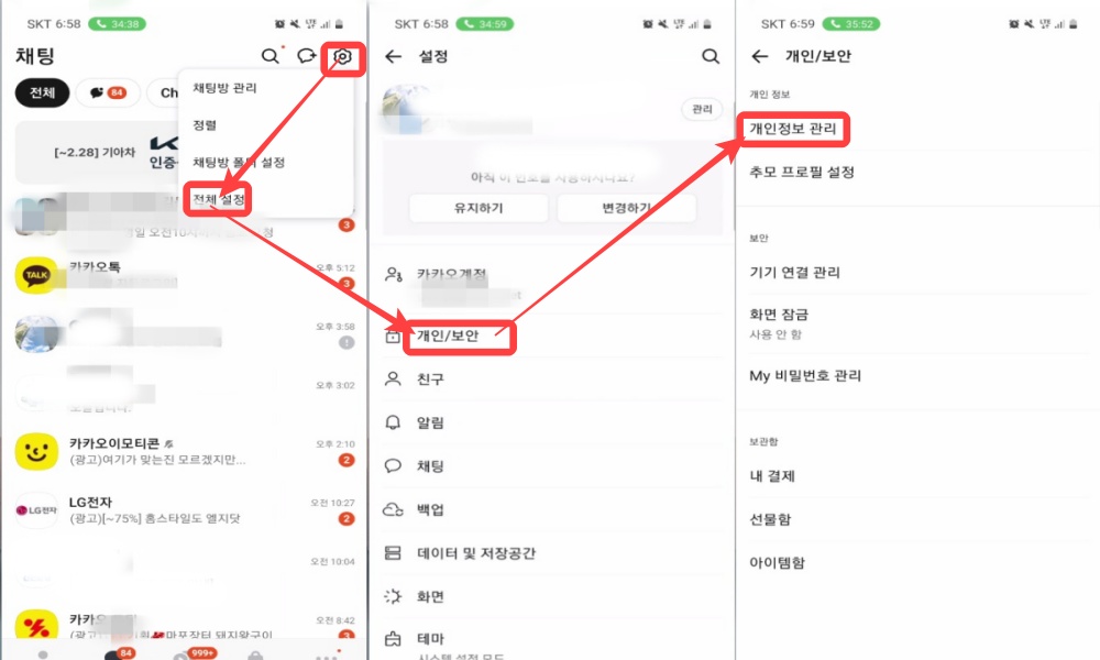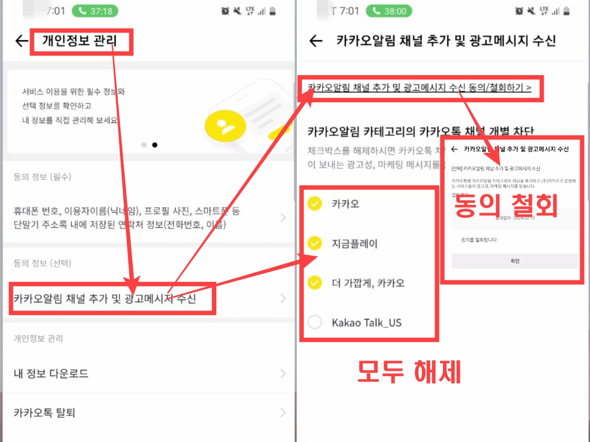- 경로: 설정 > 개인/보안 > 개인정보 관리 > 카카오알림 채널 추가 및 광고메시지 수신