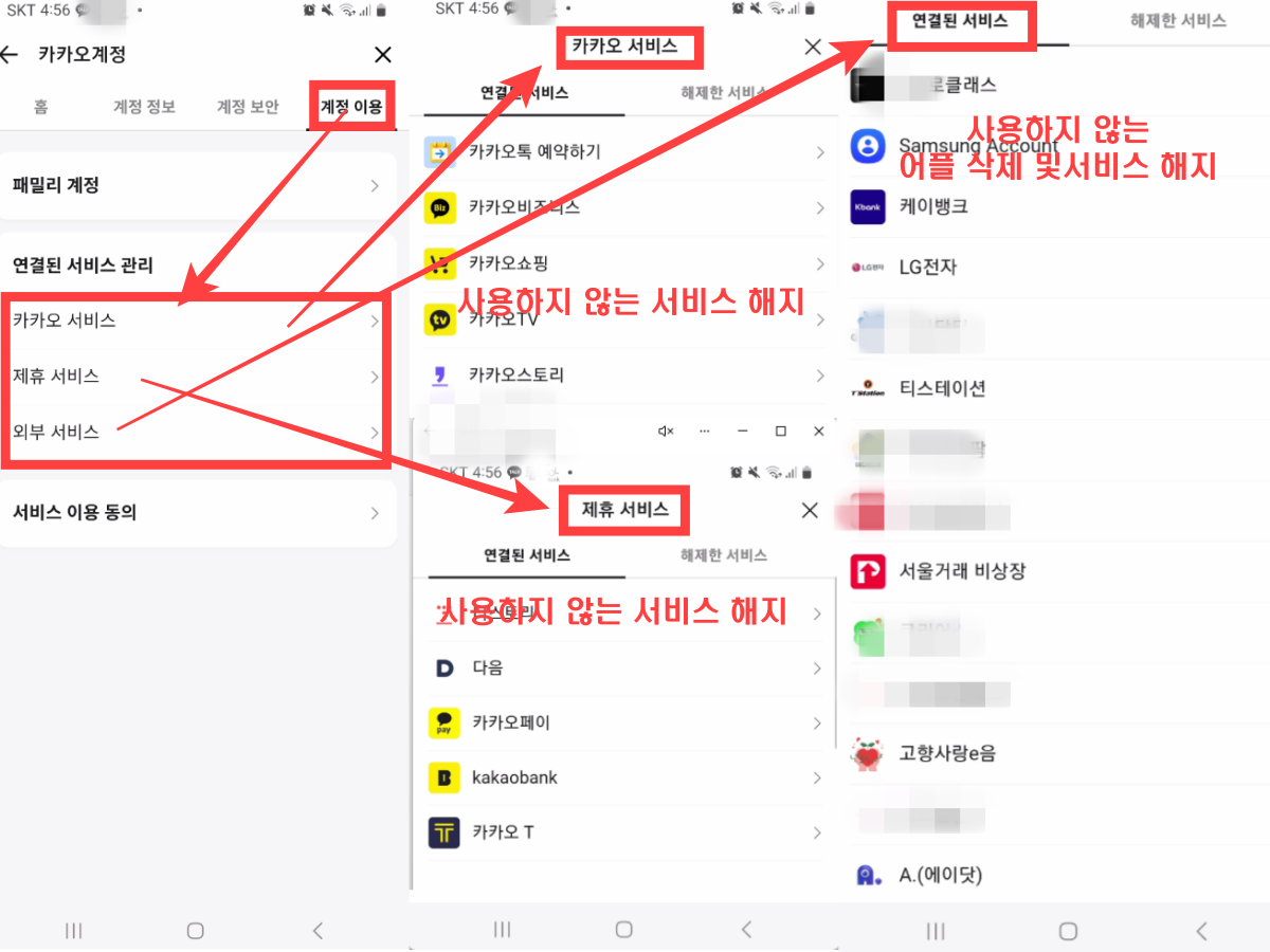 - 경로: 설정 > 개인/보안 > 카카오 계정 > 연결된 서비스 관리