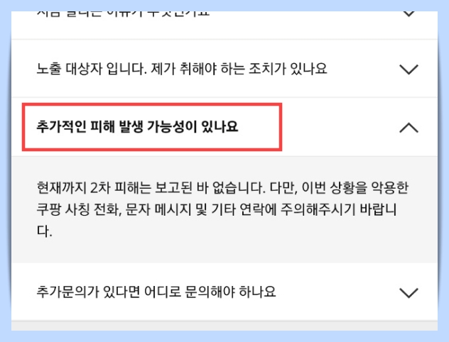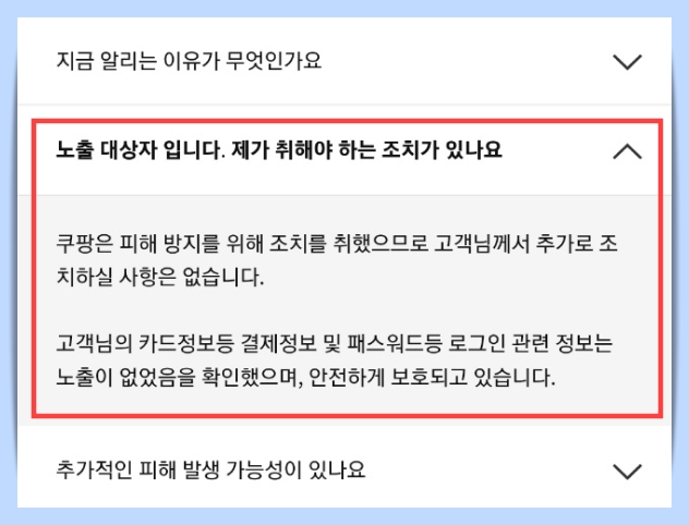 쿠팡이 피행 방지를 위해 조치 했으며 고객님이 추가로 조치할 사항은 없음 - 추가적 치해 발생 가능성?