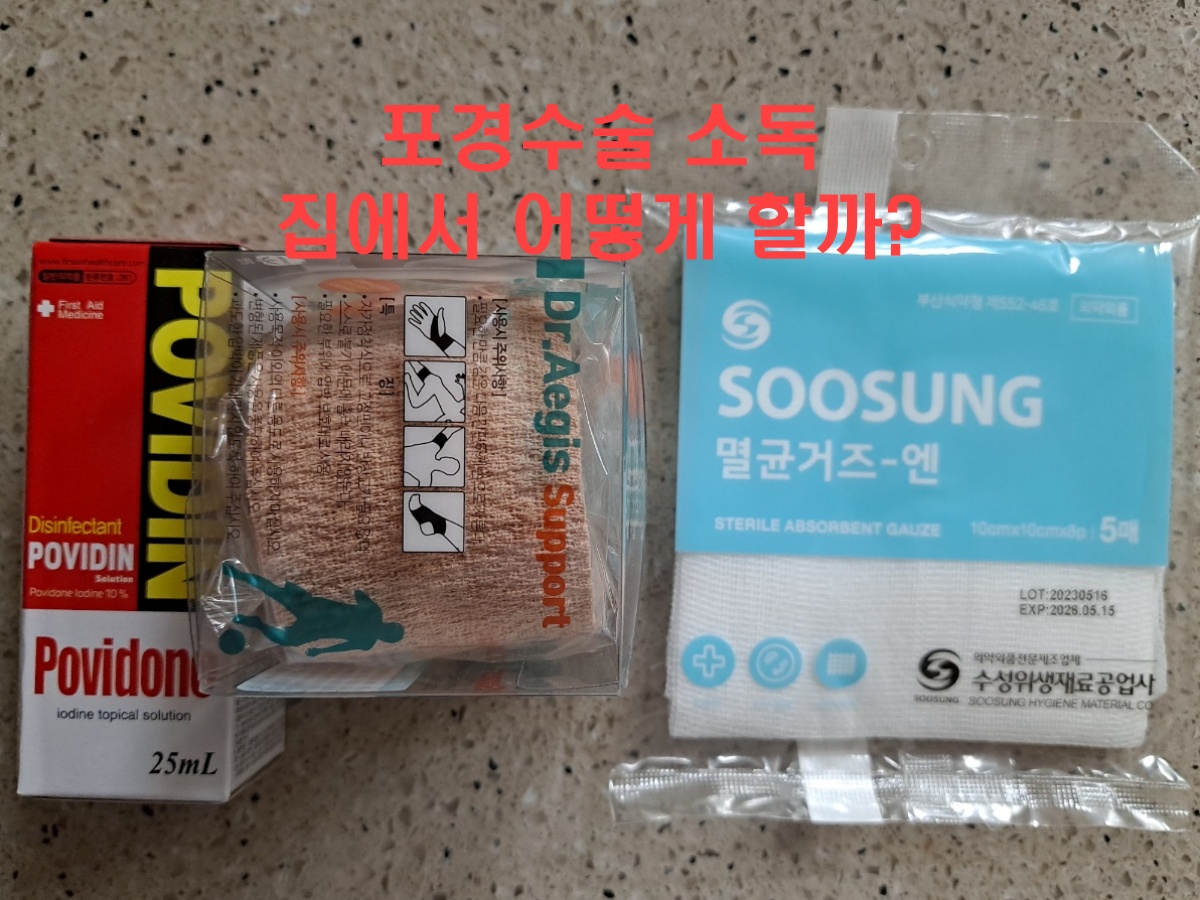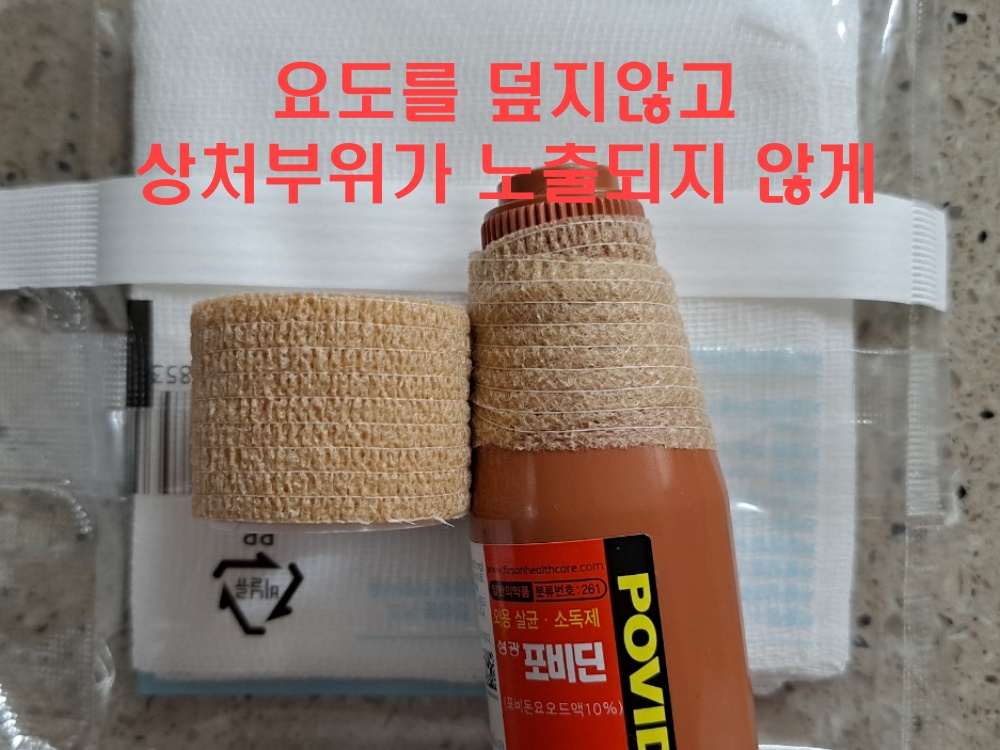 소독 방법은 간단합니다. 상처 부위에 포비돈을 바른 후 거즈로 감고 탄력 밴드로 살짝 감아주면 됩니다.