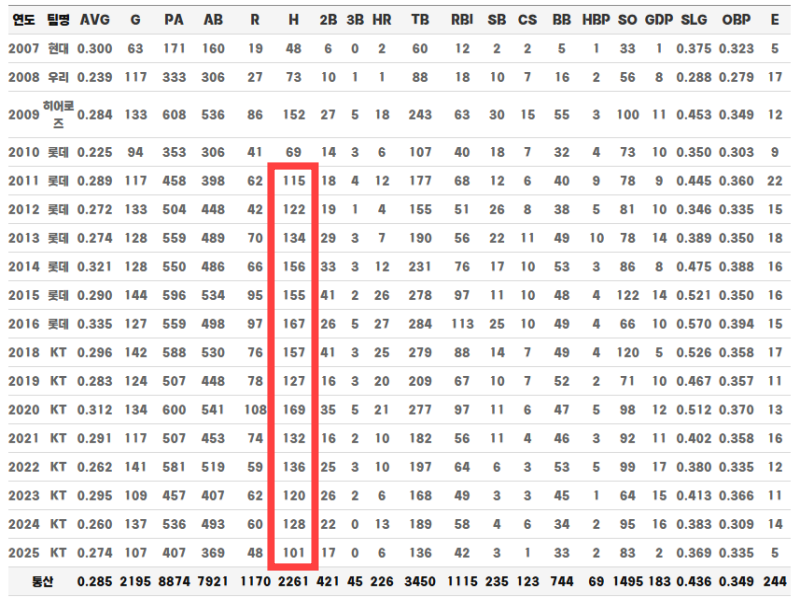 황재균은 2006년 현대 2차 3라운드 24순위 지명으로 프로 무대에 데뷔해 어느새 30대 후반을 바라보는 베테랑 선수로 성장했어요. 많은 선수가 짧은 전성기를 남기고 사라지지만, 그는 해마다 비슷한 성적을 쌓으며 팀의 중심을 지켰지요. 14시즌 연속 100안타라는 성과는 단순한 공격 지표가 아니에요. 매년 130경기 이상 소화할 수 있는 체력 관리 능력과 타석에서의 꾸준한 집중력으로 팀과 감독의 신뢰를 얻어야 가능한 기록이죠. 2011년 115안타를 시작으로 2025년 101안타로 14시즌 연속 100안타 기록은 황재균이 단순히 좋은 선수가 아니라, 신뢰받고 노력하는 선수라는 사실을 증명하는 거라 할 수 있어요. 황재균 선수의 꾸준함 응원해요.