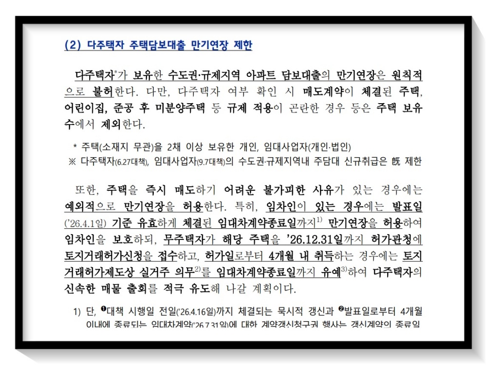 이번 방안은 무조건 일괄 금지가 아니라 예외도 함께 두고 있습니다. 우선 다주택자 여부를 판단할 때 매도계약이 체결된 주택, 어린이집, 준공 후 미분양주택처럼 규제 적용이 곤란한 경우는 보유 주택 수에서 제외합니다. 또 주택을 즉시 매도하기 어려운 불가피한 사유가 있는 경우에는 예외적으로 만기연장을 허용합니다. 대표적인 경우가 임차인이 있는 집입니다. 발표일인 2026년 4월 1일 기준 유효하게 체결된 임대차계약이 있으면 그 임대차계약 종료일까지 만기연장을 허용합니다.
