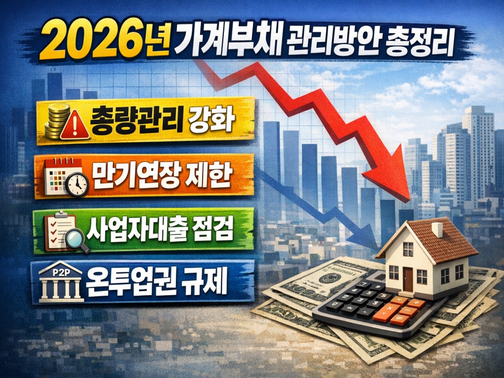 2026년 가계부채 관리방안은 크게 네 방향으로 이해하면 쉽습니다. 첫째, 2026년 가계대출 증가율을 1.5%로 묶고 2030년까지 가계부채 비율을 80%로 낮추겠다는 총량관리 강화입니다. 둘째, 다주택자와 임대사업자의 수도권·규제지역 아파트 담보대출 만기연장을 원칙적으로 불허하는 조치입니다. 셋째, 2021년 이후 사업자대출을 전면 점검하고 용도 외 유용 제재를 대폭 강화하는 것입니다. 넷째, 온투업권까지 규제를 확대해 풍선효과를 차단하겠다는 것입니다.