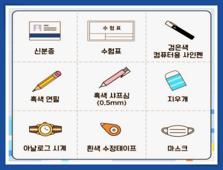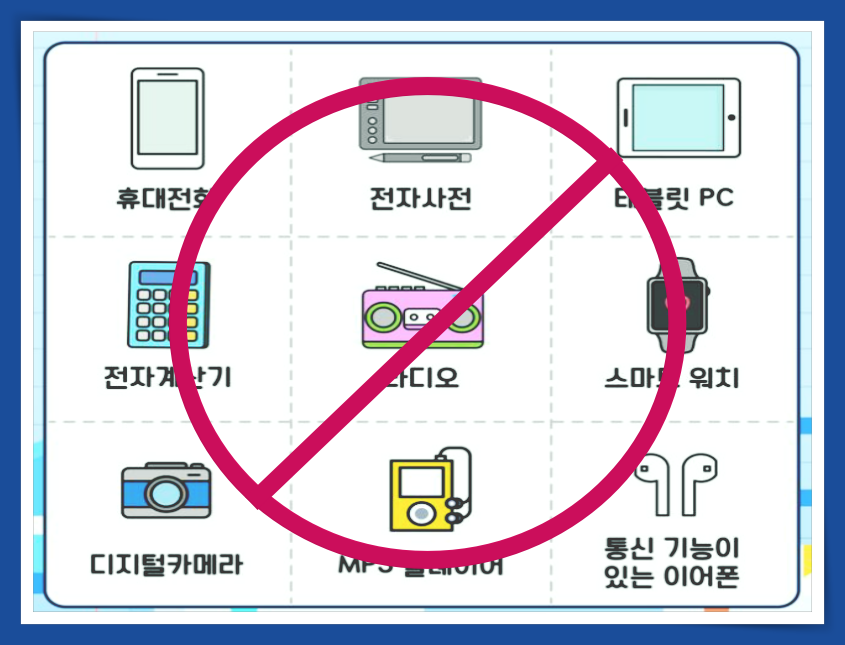 만일 전자기기를 가지고 갔다면 반드시 1교시 시작 전 제출해야해요. 시험이 시작된 후로는 소지하고있다는 것만으로도 퇴실 대상이 돼요. 아무리 강조해도 매년 몇명씩 등장하는 사건이죠. 가방 속에서 진동이 울려 감독관에게 적발된 사례요. '그냥 꺼둔 건데요'라고 말해도, 규정상 부정행위입니다. 절대 '괜찮겠지'라는 생각을 하지 마시고 제출하고, 집에서 부터 가지고 가지 않는게 좋아요.