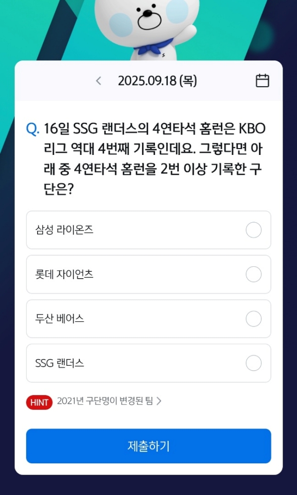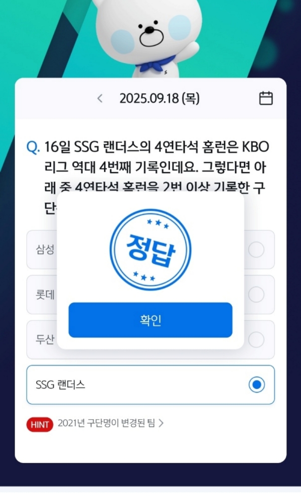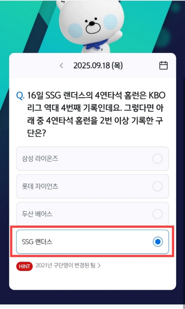 힌트에 보니 2021년 구단명이 변경된 팀이라고 나와서 SSG를 직감했어요.